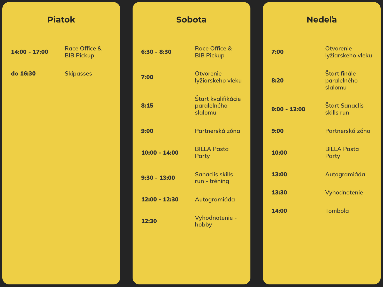 Highlightom programu bude spomínaný paralelný slalom, no svoje zručnosti si môžu pretekári overiť aj počas Sanaclis skills run – a sacharidy doplnia počas BILLA Pasta Party. V rámci BILLA Pasta Party si návštevníci pochutnajú na cestovinových jedlách, ktoré doplnia energiu deťom aj dospelým. Keďže sa BILLA dlhodobo snaží inšpirovať verejnosť k pohybu a vyváženej strave, postará sa aj o prísun ovocia, zeleniny, mliečnych výrobkov či kvalitných produktov svojich privátnych značiek pre športujúcu mládež.