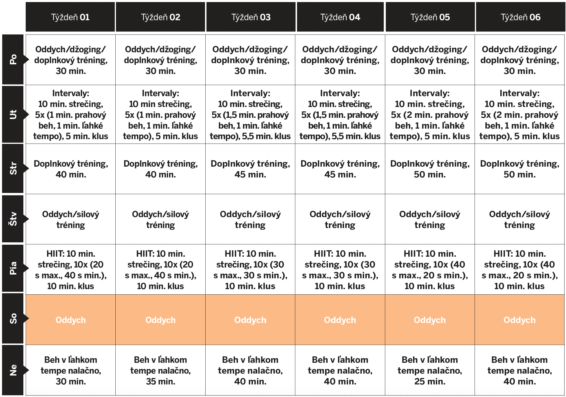 Tento tréningový plán predpokladá, že máte akú-takú kondíciu, ak vám však dochádza pri ťažkých intervaloch dych a máte pocit, že potrebujete predĺžiť oddychovú fázu, pokojne tak urobte. Vždy načúvajte svojmu telu. Pri náročných častiach HIIT by ste nemali byť schopní rozprávať.