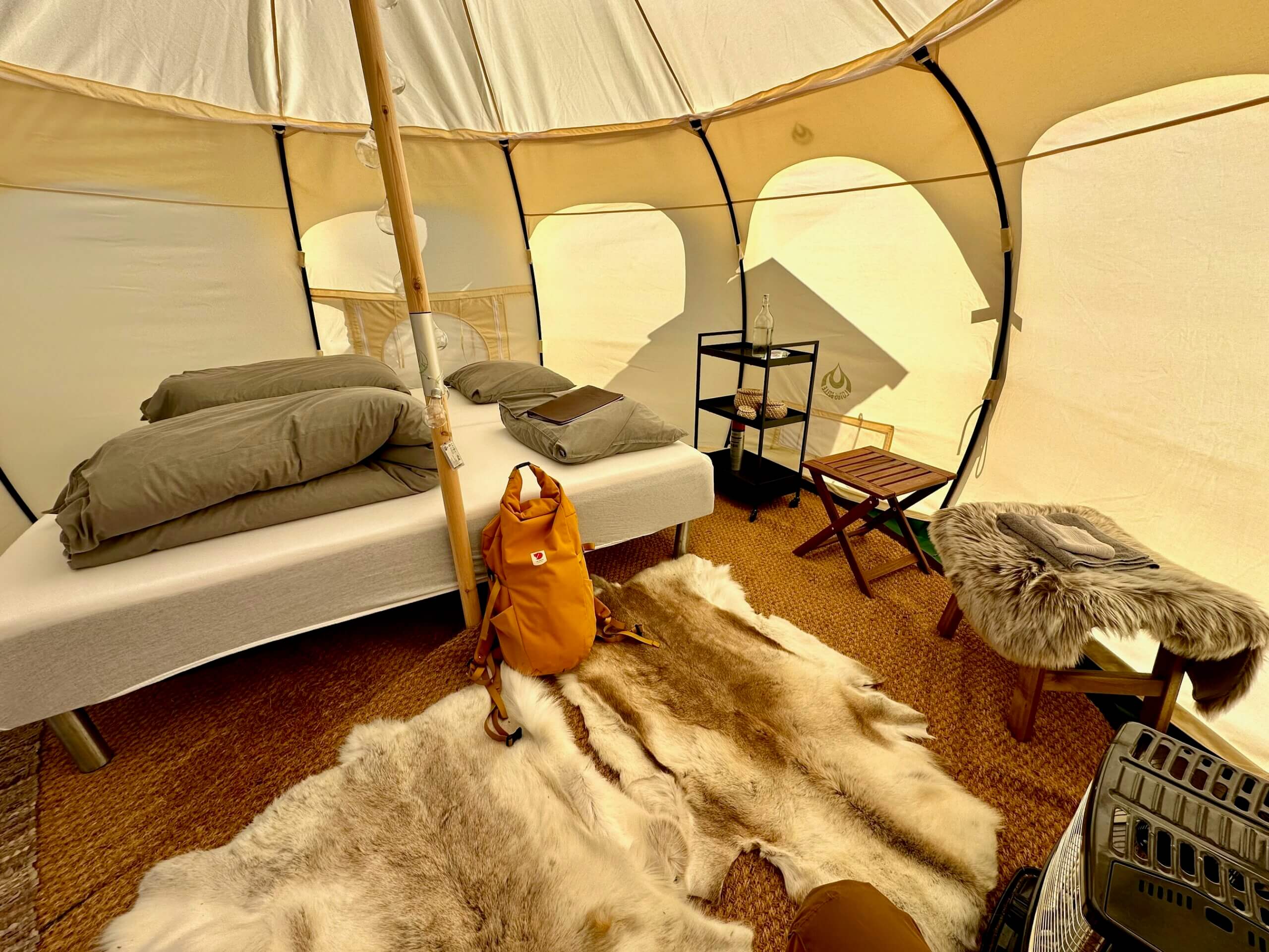 Interiér glampingového stanu so sobími kožami a pieckou. Foto: Ľuboš Fellner / BUBO.