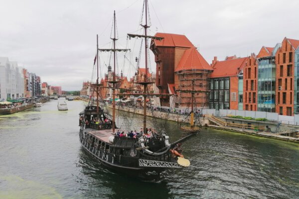 Voda je dôležitým prvkom života Gdanska, preto našu návštevu ukončíme pri rieke Motława. Ikonickou stavbou je Żuraw, najväčší a najstarší zachovaný prístavný žeriav zo stredoveku. Vnútri boli dve kolesá, v ktorých namiesto škrečkov behali ľudia. Pri káve alebo obede môžete pozorovať dvíhanie a otáčanie mostov či kontrast starých a moderných budov na oboch brehoch kanála.