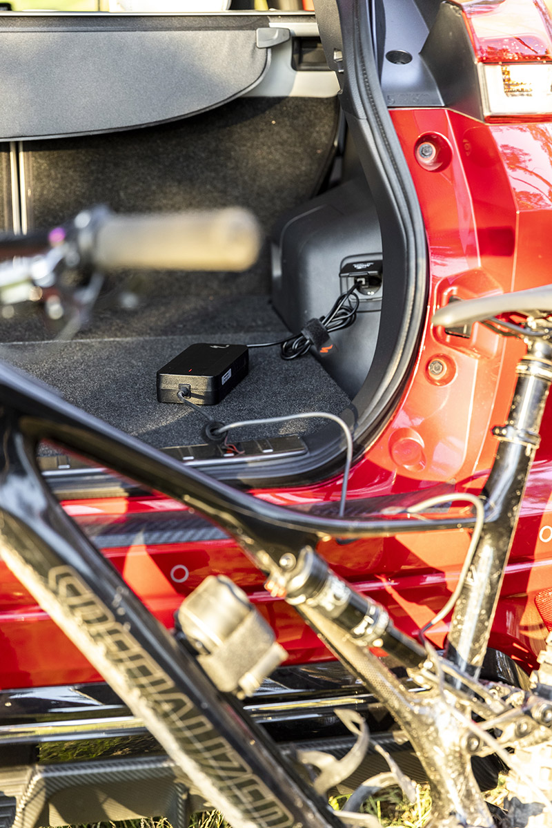 Bike s odmontovaným predným kolesom doň vojde úplne s prehľadom a pre dobrodružné typy má Mitsubishi v kufri ešte jedno prekvapenie. Je ním plnohodnotná 220 – 240V zásuvka, ktorá čerpá energiu zo zabudovanej batérie. Vďaka príkonu až 1500 W sú možnosti, ako ju využiť mimo civilizácie, takmer neobmedzené.